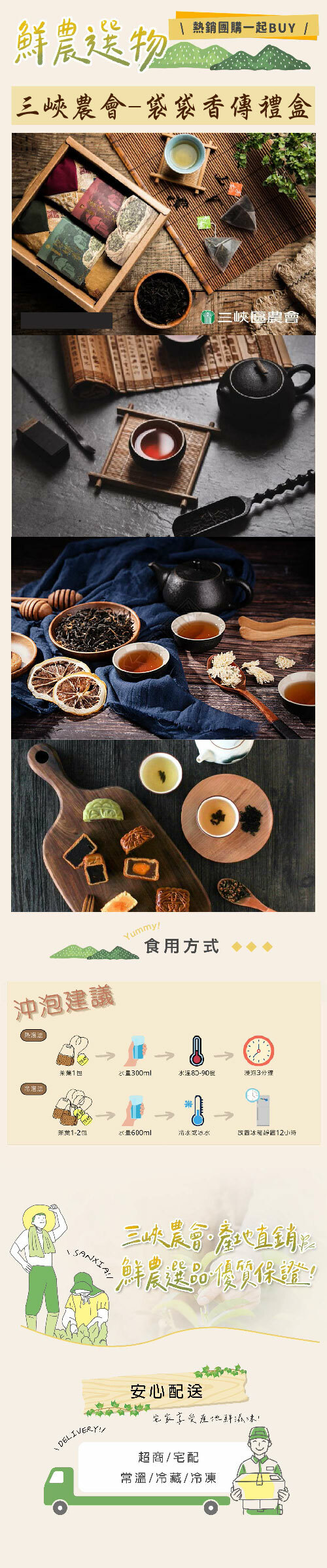 日治時期農會草創的印記.三峽畫家李梅樹設計的茗茶廣告.光復初期的中美合作麵粉袋,百納拼堆出三峽茶史印象與特色茶種,也象徵我們揉捻融合傳統與現代飲茶文化的努力。